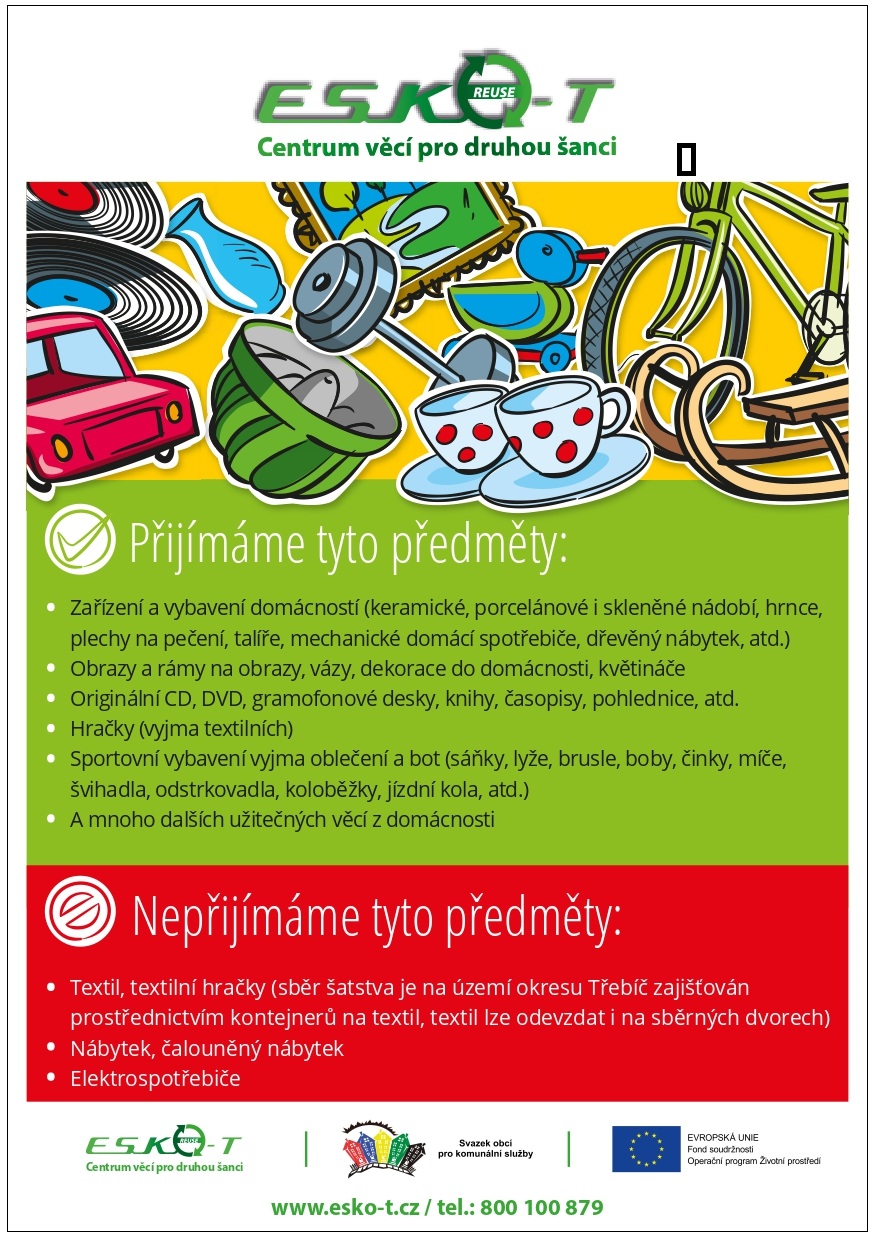 Celou řadu funkčních, ale pro nás již nepotřebných věcí můžeme odevzdat v Centru věcí pro druhou šanci, tzv. RE-USE centra. Provozovatel "Centra" darované věci zpeněží za symbolickou cenu, čímž zajistí opětovné využití věcí a rovněž získá prostředky na projekt útulku pro opuštěná zvířata Třebíč.